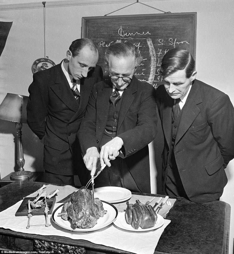 Mr Bretson, one of Britons renowned butlers, shows two students the correct technique to carve various joints of fowl at the table PHOTO:MEDIADRUMIMAGES.COM/TOPFOTO/R